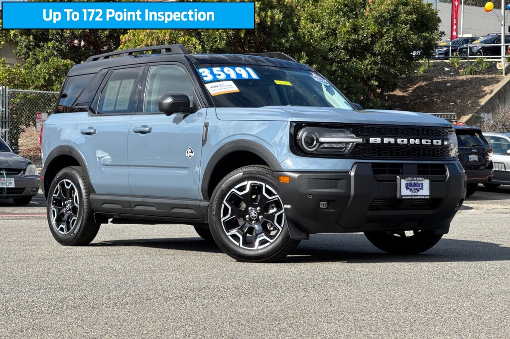 Recent Arrival! Certified. New Price! Clean CARFAX. ***ONE OWNER W/CLEAN CARFAX***, ***LOCAL TRADE***, ***DEALER SERVICE***, ***BALANCE OF FACTORY WARRANTY***, ***BACKUP CAMERA & BLUETOOTH***, ***ADAPTIVE CRUISE CONTROL W/STOP & GO***, ***FRONT AND REAR PARK ASSIST***, ***POWER LOCKS, WINDOWS, MIRRORS***, ***360 DEGREE CAMERA***, ***PREMIUM AUDIO BY B&O W/8 SPKR.***, ***360 DEGREE CAMERA***, ***13.2" TOUCHSCREEN CNCTD BUILT-IN NAVIGATION***, ***POWER FRONT SEATS***, ***SIRIUSXM W/HD RADIO***, **HEATED FRONT SEATS**, **HEADLAMPS-AUTO LED AUTO HIGH BEAM W/SIGNATURE LED LIGHTING**, Bronco Sport Outer Banks, 1.5L EcoBoost, 4WD, Platinum Blue w/Premium Trimmed Front Bucket Seats w/Platinum Blue. Odometer is 2099 miles below market average! 25/30 City/Highway MPG Azure Gray Metallic Tri-Coat 2025 Ford Bronco Sport Outer Banks 4WD 8-Speed Automatic 1.5L EcoBoost