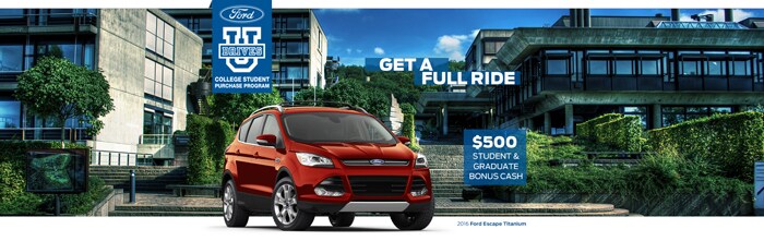 Congratulations! You’ve made a big commitment and investment in your future…and FORD wants to invest in you too! As a College Student or recent Graduate, you’re eligible for $500 in Ford Student or Graduate Bonus Cash. Purchase or lease an eligible new Ford during the program period and you’ll get an extra $500 in incentive bonus cash over and above other incentives and discounts you receive.